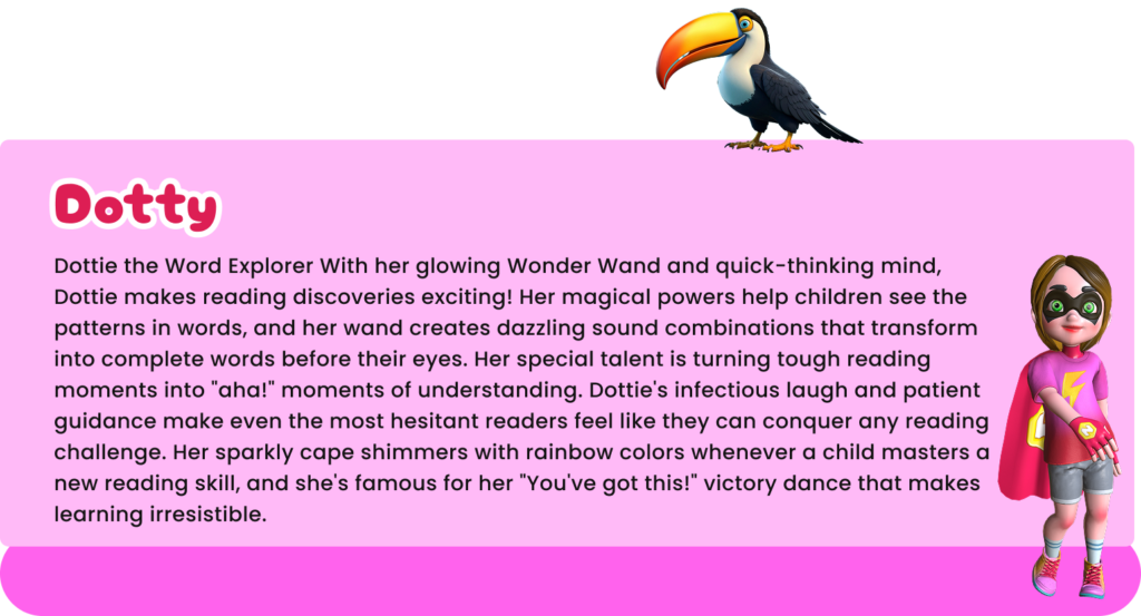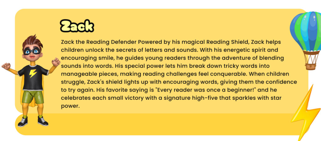 In our interactive universe, children don’t just learn – they become reading champions while battling alongside Zack and Dottie against DJ’s playful mischief. Through engaging games and clever puzzles, young readers develop essential reading skills without even realizing they’re learning. We’re not just teaching reading; we’re awakening the reading superhero in every child!